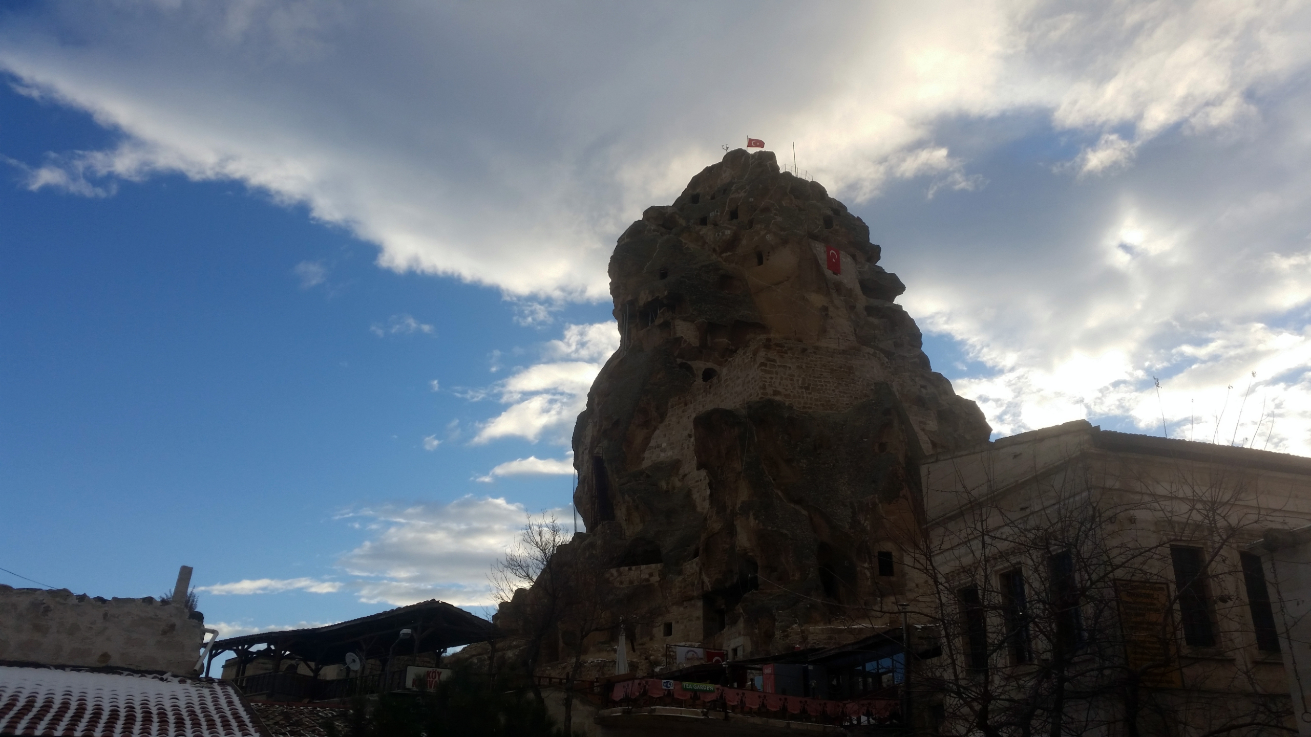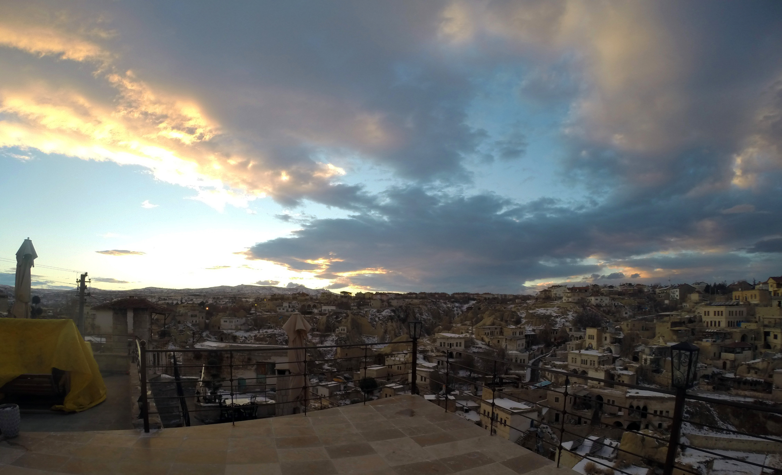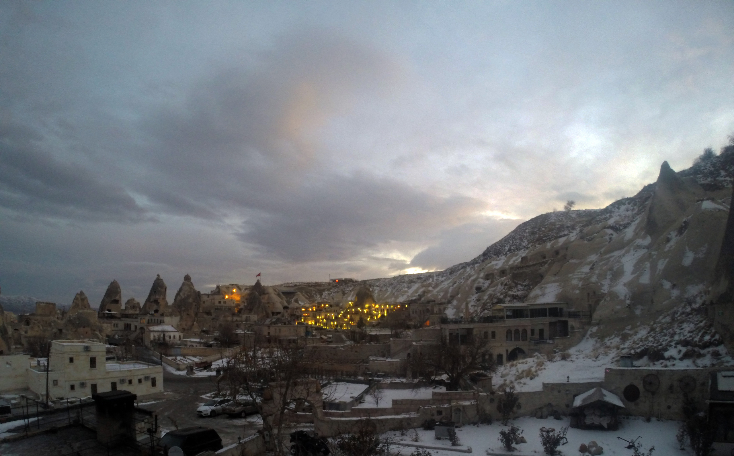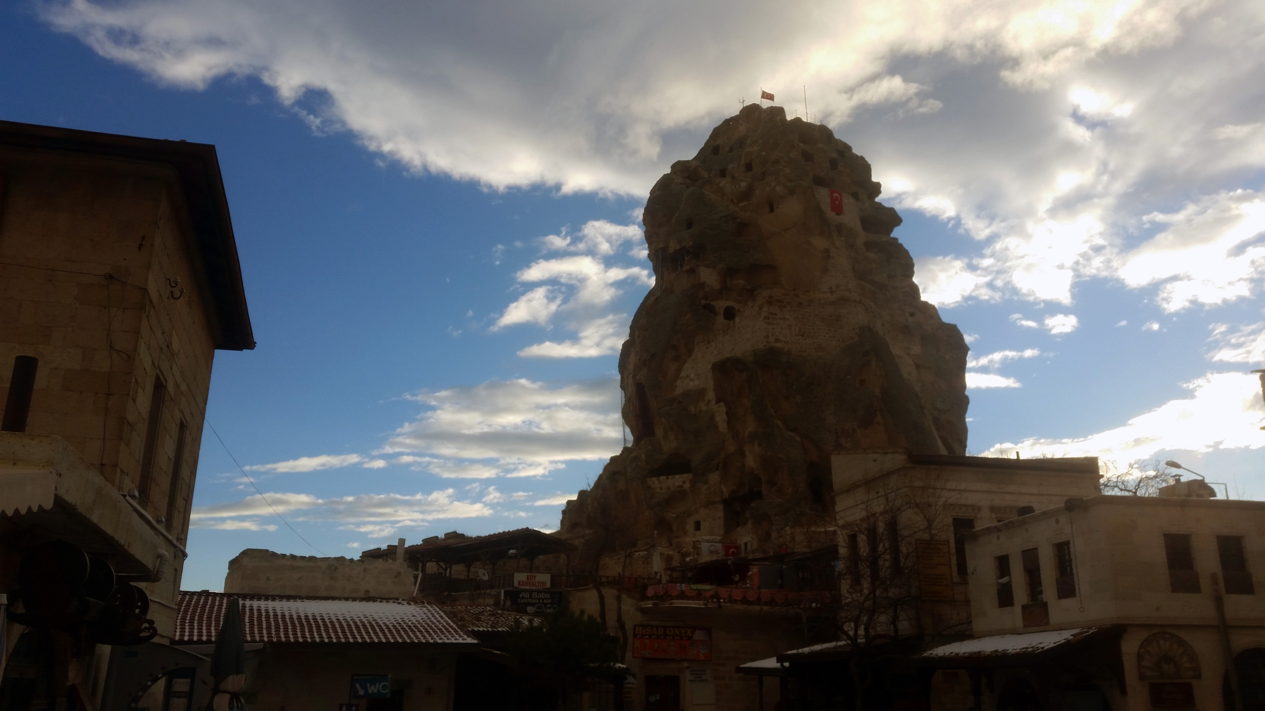В этот вечер был красивый закат с быстроплывущими облаками и хорошей видимсотью, по крайней мере вулкан Эрджияс был отчетливо виден. Очень хотелось сделать таймлапс этого самого заката, но к сожалению попасть на вершину крепости у нас не получилось, так как открыта она зимой для посещения туристами лишь до 17.00, а мы добрались до нее лишь в начале шестого.