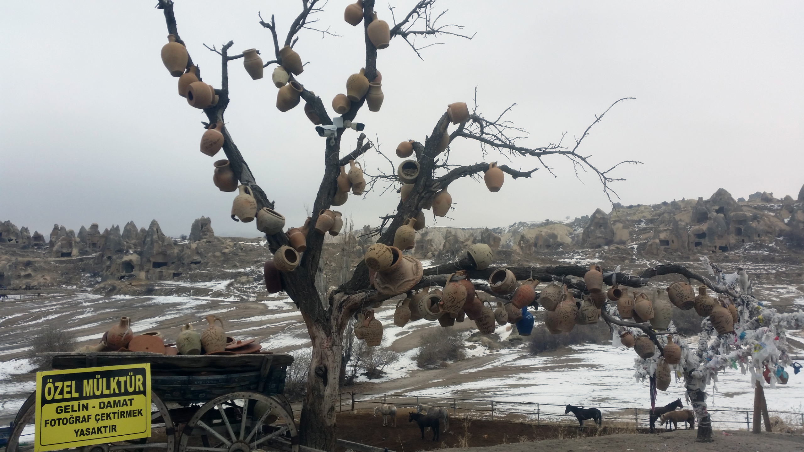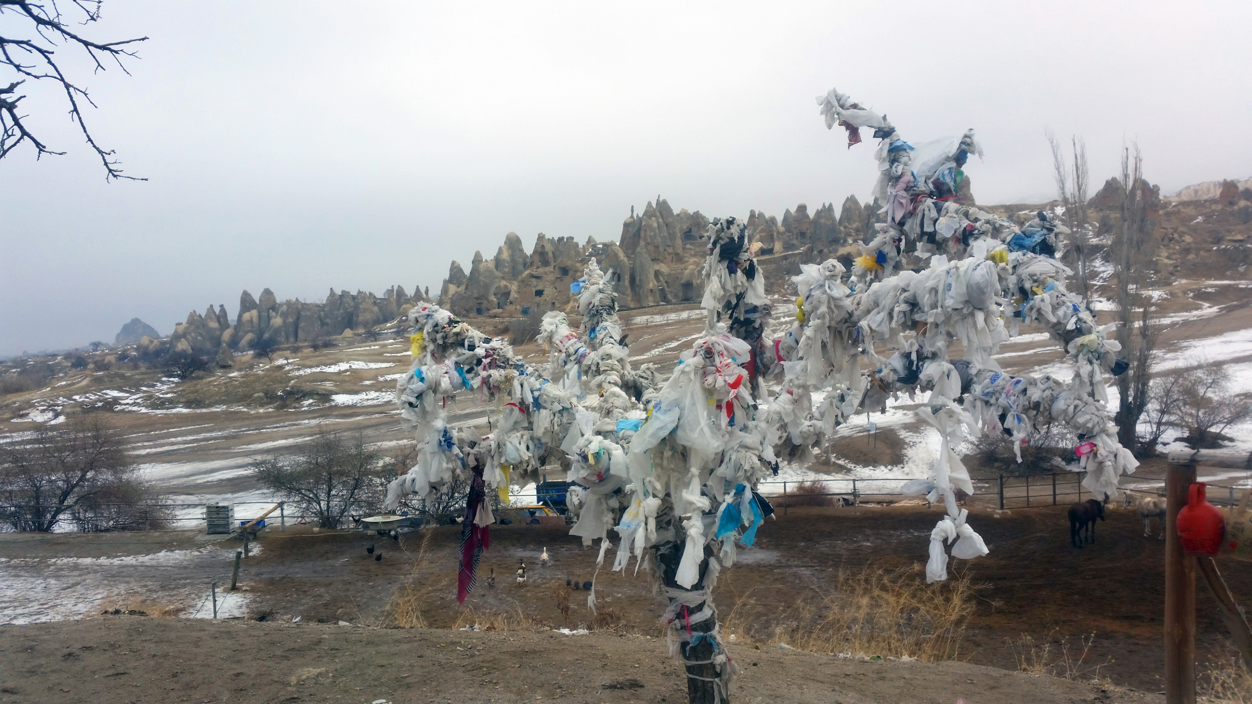 Одно дерево полностью обвязано ленточками, на втором висят десятки глиняных горшков, а на третьем сотни турецких амулетов от сглаза.